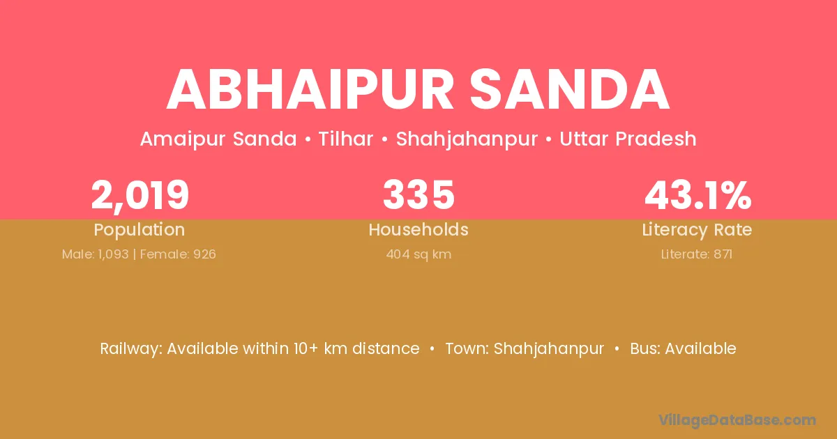 Abhaipur Sanda village has a total population of 2,019 people, of which 1,093 are males and 926 are females.
