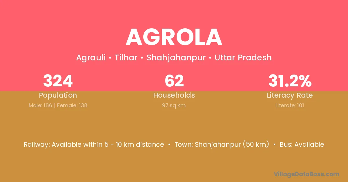Shahjahanpur (50 km) is the nearest town to Agrola village for major economic activities and is located approximately 50 km away.