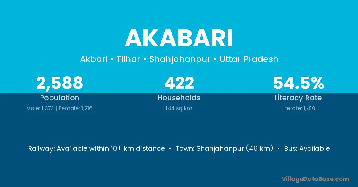 Shahjahanpur (46 km) is the nearest town to Akabari village for major economic activities and is located approximately 46 km away.