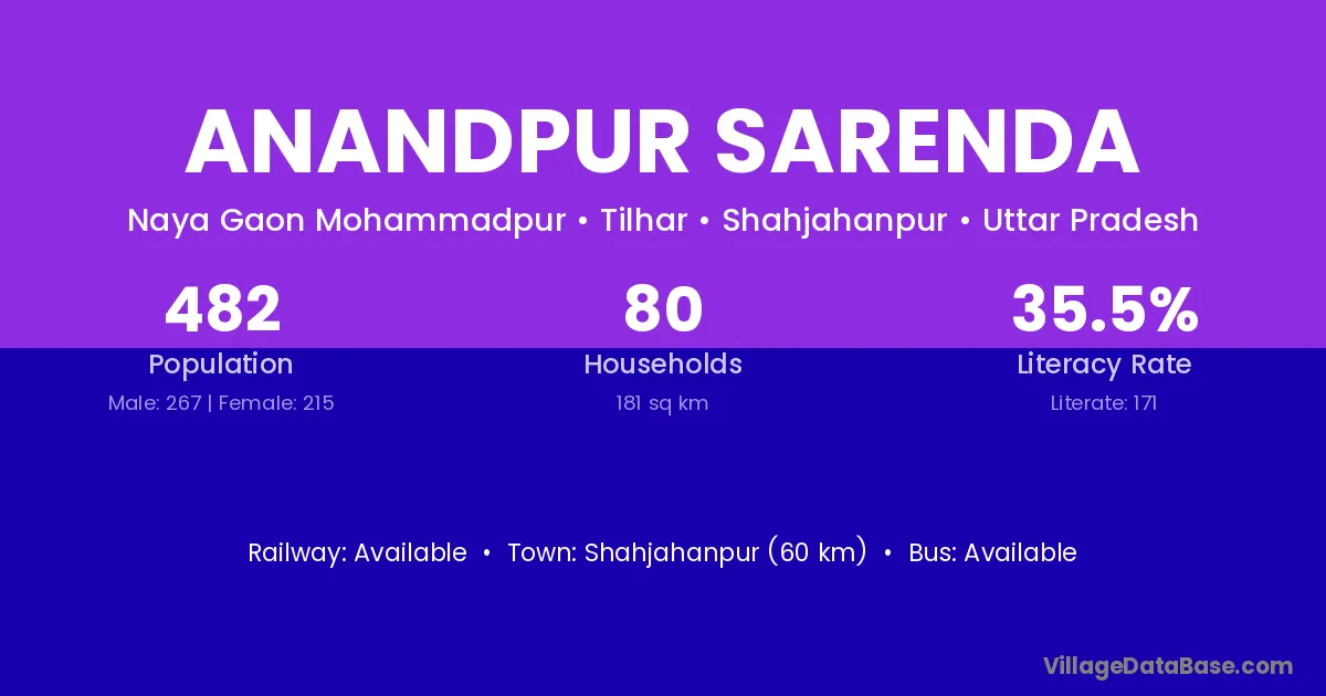 Shahjahanpur (60 km) is the nearest town to Anandpur Sarenda village for major economic activities and is located approximately 60 km away.