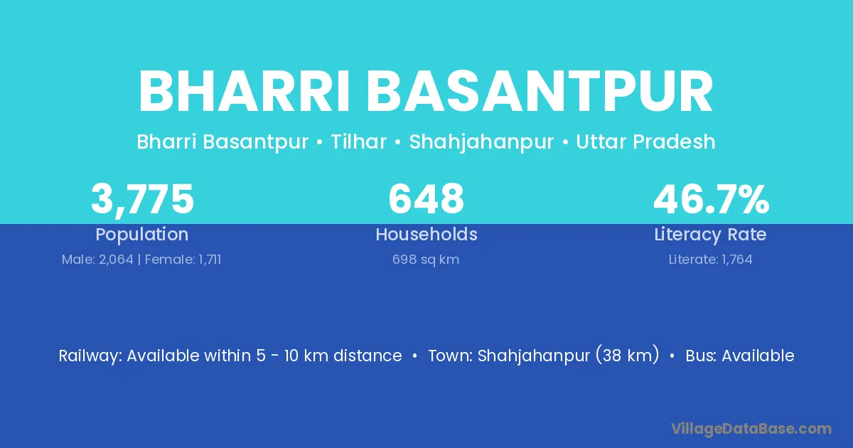 Shahjahanpur (38 km) is the nearest town to Bharri Basantpur village for major economic activities and is located approximately 38 km away.