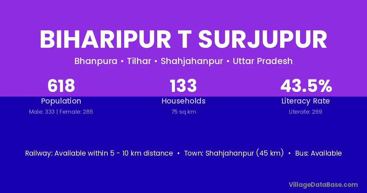 Shahjahanpur (45 km) is the nearest town to Biharipur T Surjupur village for major economic activities and is located approximately 45 km away.