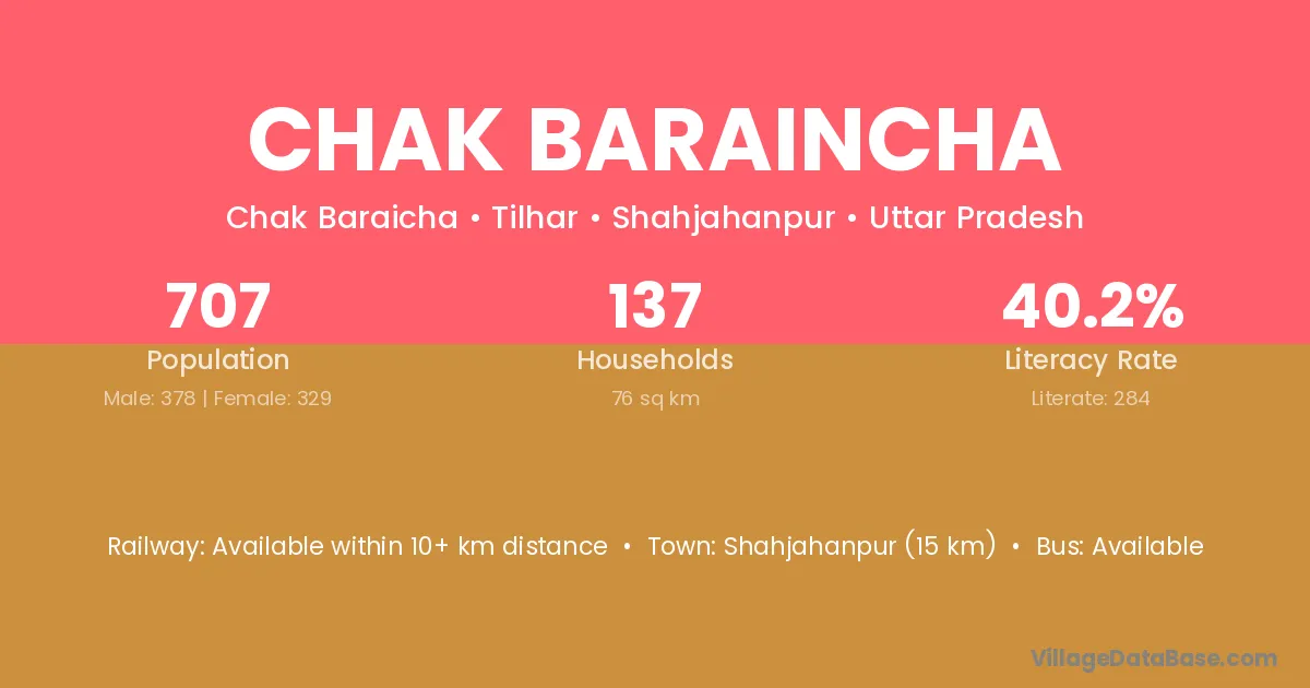 Shahjahanpur (15 km) is the nearest town to Chak Baraincha village for major economic activities and is located approximately 15 km away.