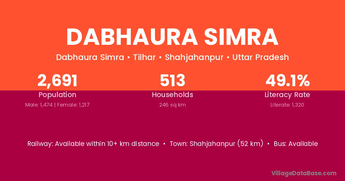 Shahjahanpur (52 km) is the nearest town to Dabhaura Simra village for major economic activities and is located approximately 52 km away.