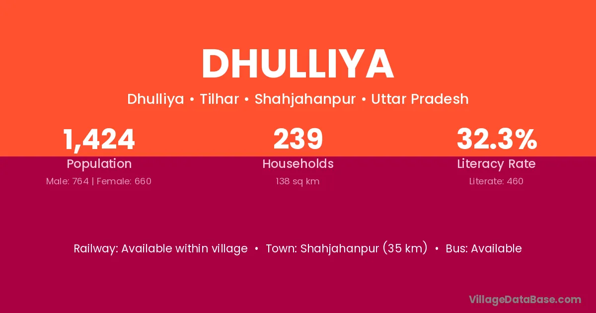 Shahjahanpur (35 km) is the nearest town to Dhulliya village for major economic activities and is located approximately 35 km away.
