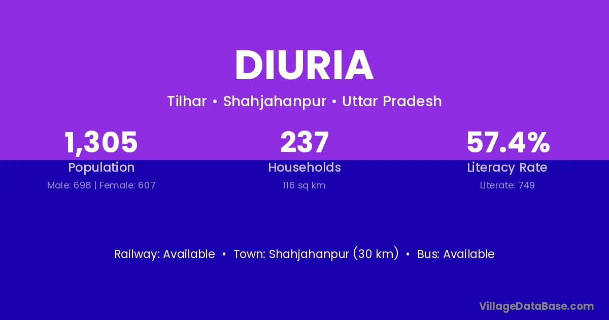 Shahjahanpur (30 km) is the nearest town to Diuria village for major economic activities and is located approximately 30 km away.