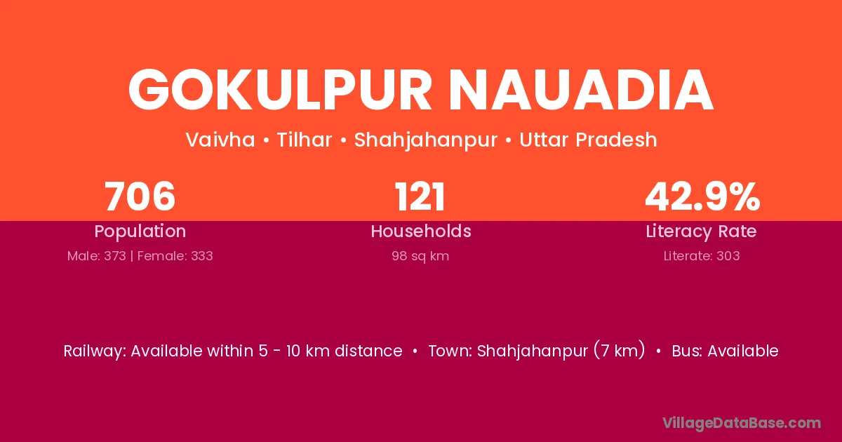 Shahjahanpur (7 km) is the nearest town to Gokulpur Nauadia village for major economic activities and is located approximately 7 km away.