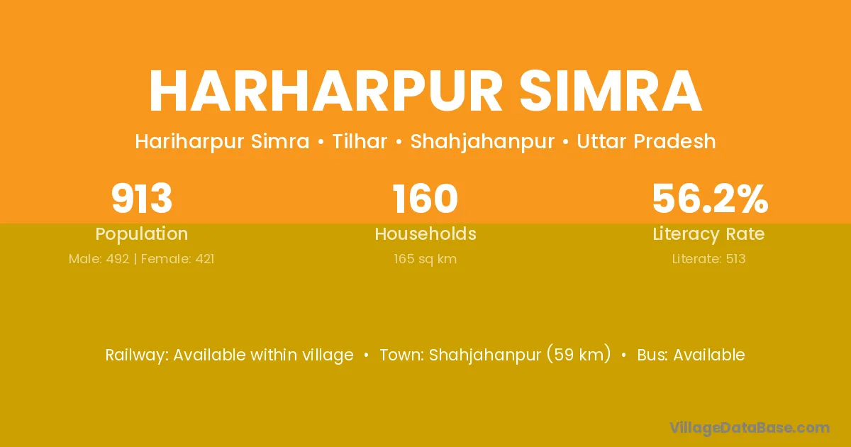 Harharpur Simra village has a total population of 913 people, of which 492 are males and 421 are females.
