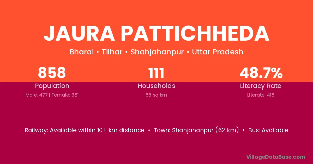 The literacy rate of Jaura Pattichheda village is 48.72%. Male literacy stands at 57.86% and female literacy at 37.27%.