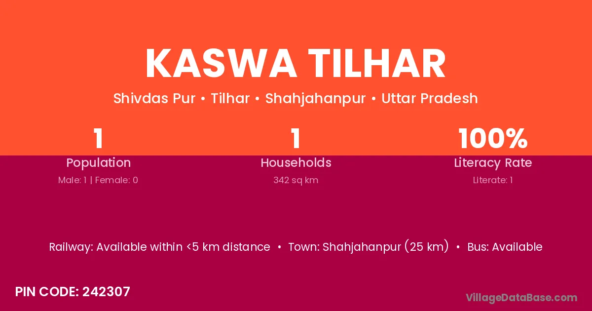 Kaswa Tilhar village has a total population of 1 people, of which 1 are males and 0 are females.
