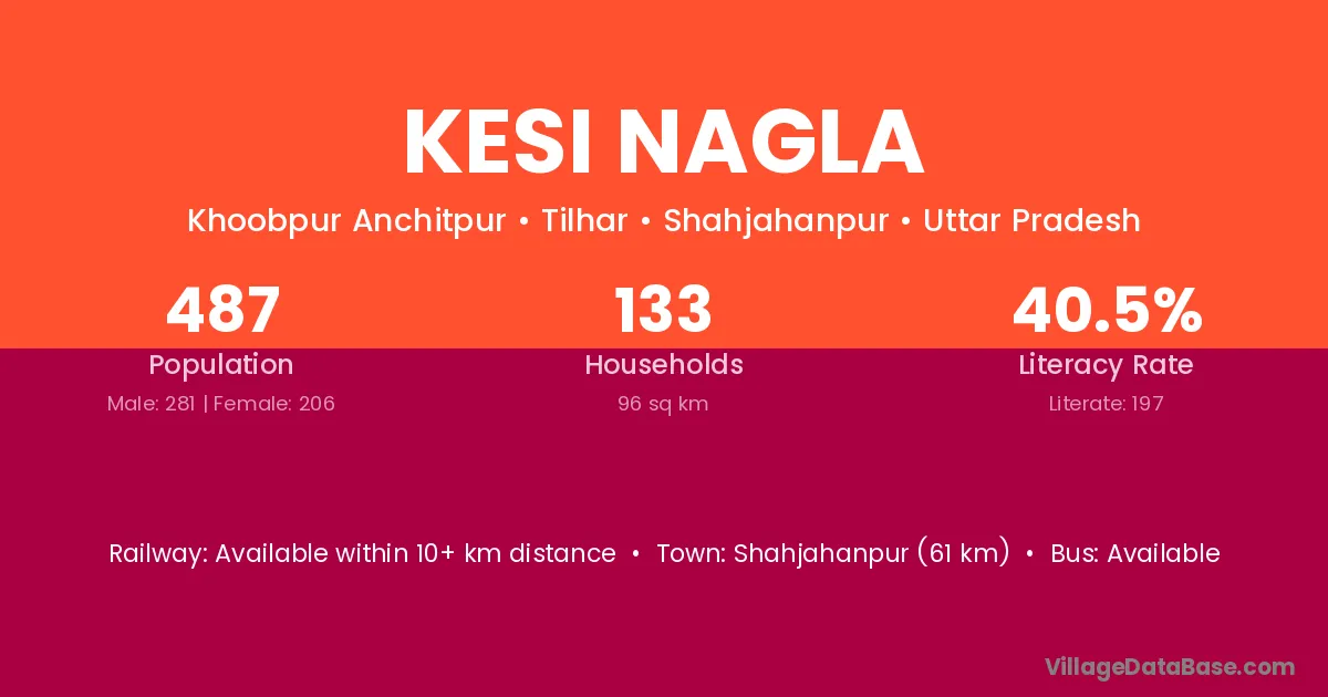 Kesi Nagla village has a total population of 487 people, of which 281 are males and 206 are females.