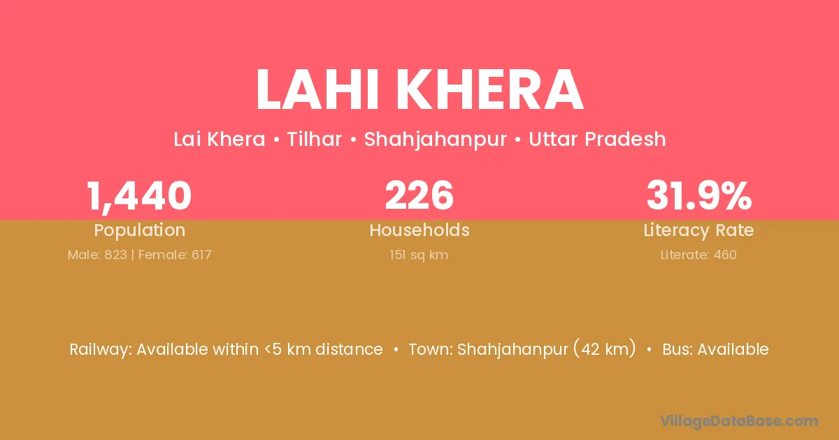 Shahjahanpur (42 km) is the nearest town to Lahi Khera village for major economic activities and is located approximately 42 km away.