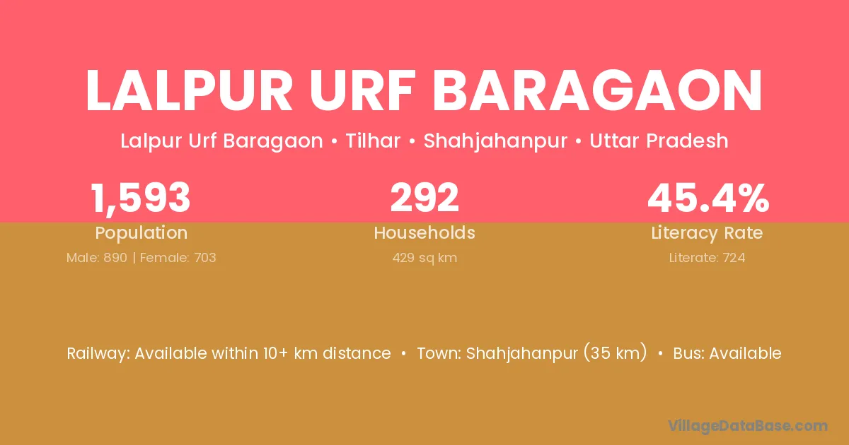Lalpur Urf Baragaon village has a total population of 1,593 people, of which 890 are males and 703 are females.