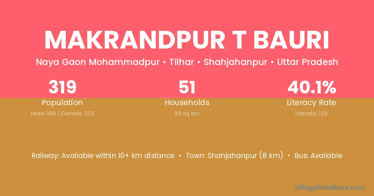 Makrandpur T Bauri village has a total population of 319 people, of which 186 are males and 133 are females.