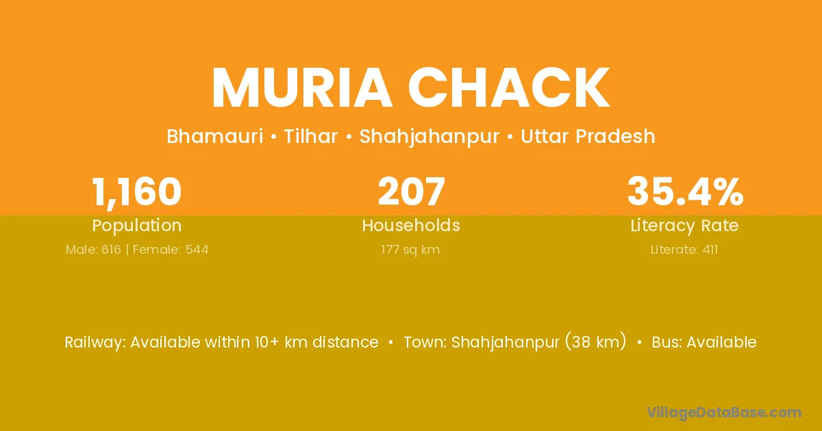 Shahjahanpur (38 km) is the nearest town to Muria Chack village for major economic activities and is located approximately 38 km away.