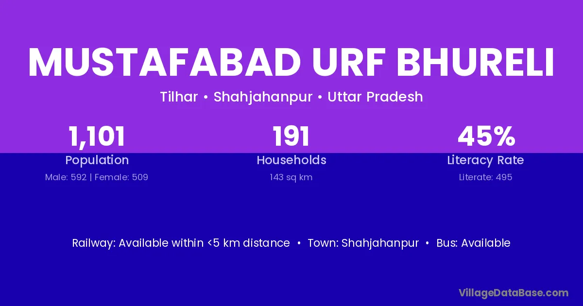 Mustafabad Urf Bhureli village has a total population of 1,101 people, of which 592 are males and 509 are females.