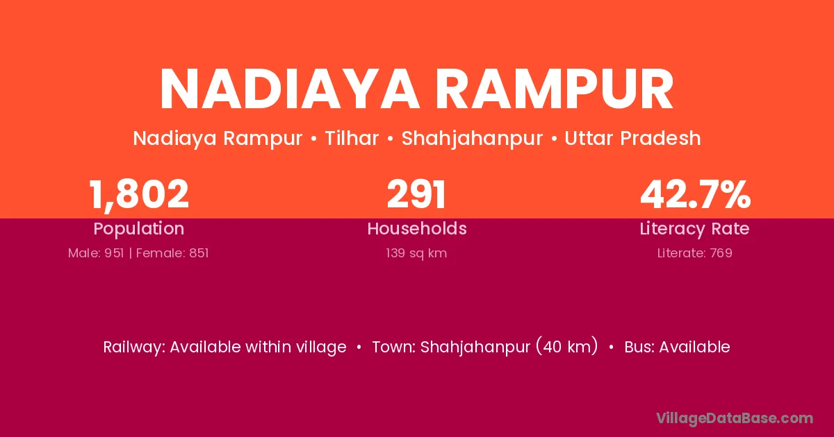 Shahjahanpur (40 km) is the nearest town to Nadiaya Rampur village for major economic activities and is located approximately 40 km away.