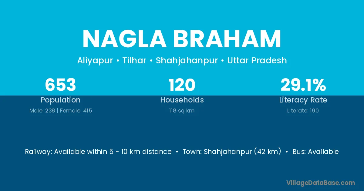 Shahjahanpur (42 km) is the nearest town to Nagla Braham village for major economic activities and is located approximately 42 km away.