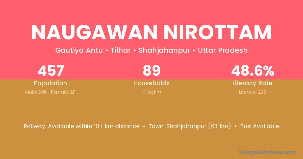 Shahjahanpur (63 km) is the nearest town to Naugawan Nirottam village for major economic activities and is located approximately 63 km away.