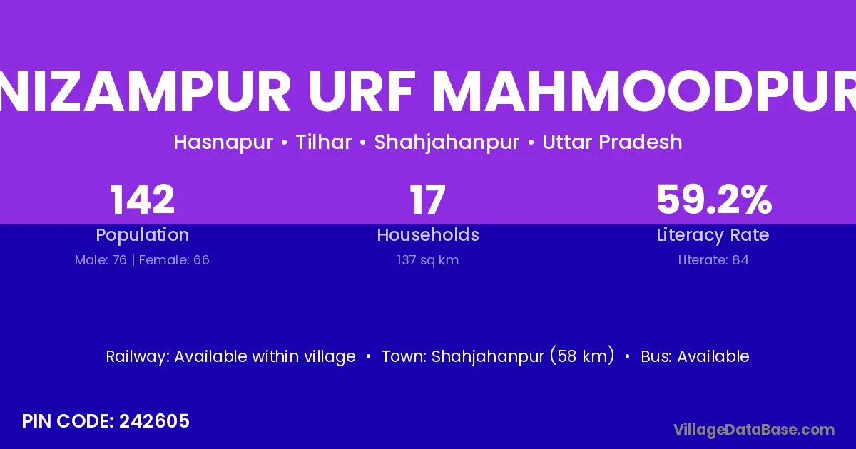 Nizampur Urf Mahmoodpur village has a total population of 142 people, of which 76 are males and 66 are females.