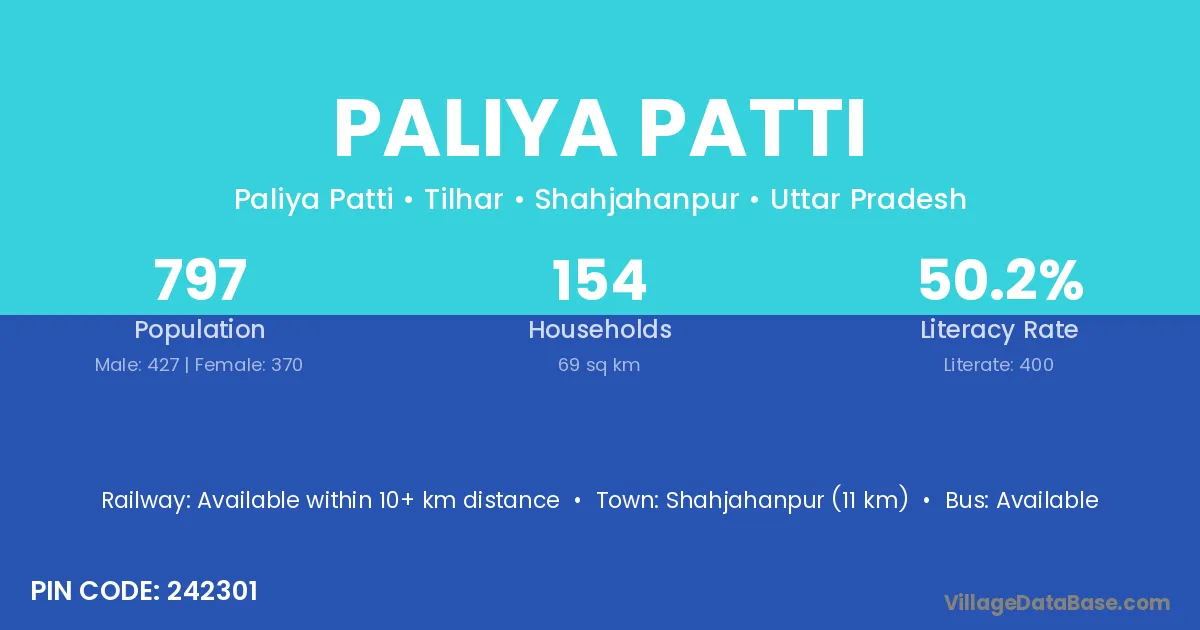 Shahjahanpur (11 km) is the nearest town to Paliya Patti village for major economic activities and is located approximately 11 km away.