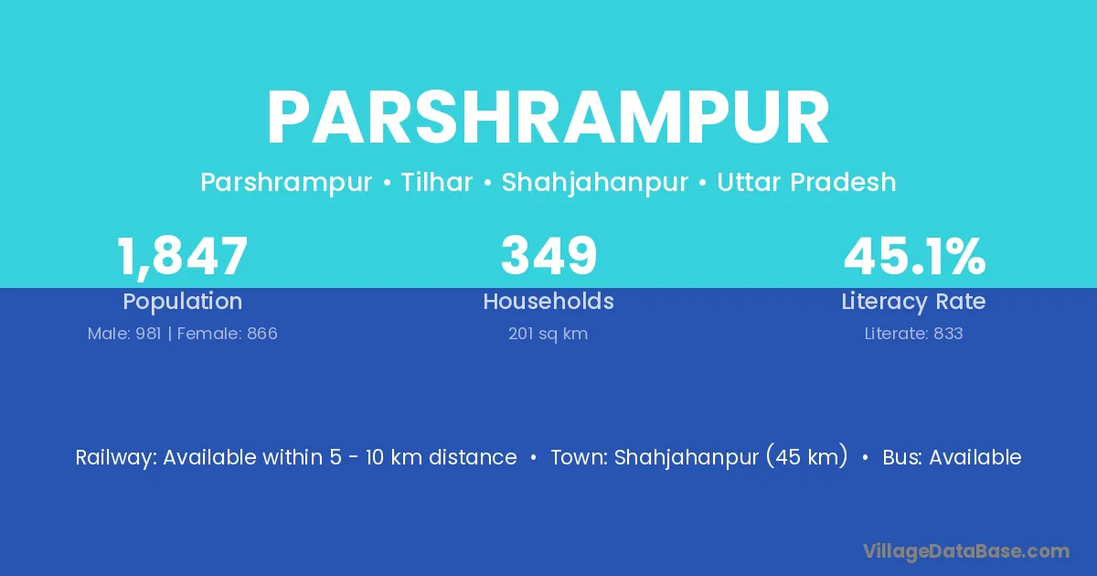 Shahjahanpur (45 km) is the nearest town to Parshrampur village for major economic activities and is located approximately 45 km away.