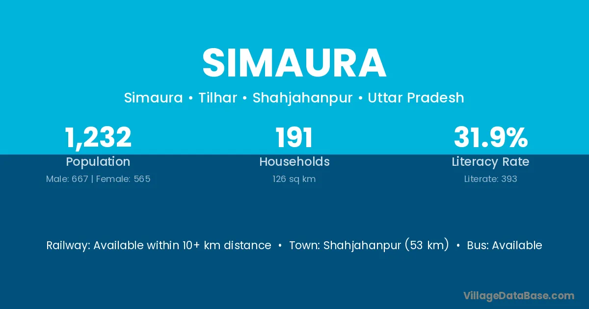 Shahjahanpur (53 km) is the nearest town to Simaura village for major economic activities and is located approximately 53 km away.
