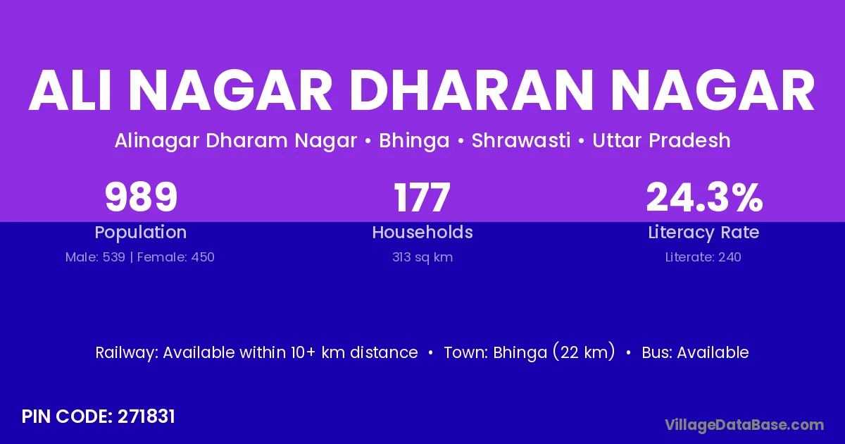 Bhinga (22 km) is the nearest town to Ali Nagar Dharan Nagar village for major economic activities and is located approximately 22 km away.
