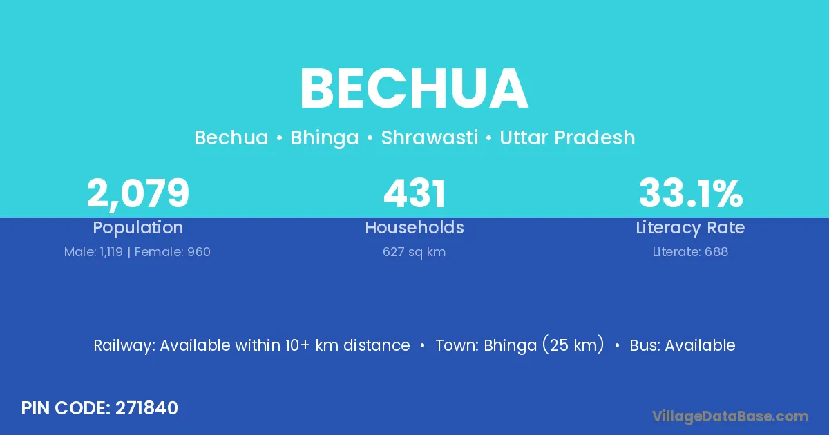 Bhinga (25 km) is the nearest town to Bechua village for major economic activities and is located approximately 25 km away.