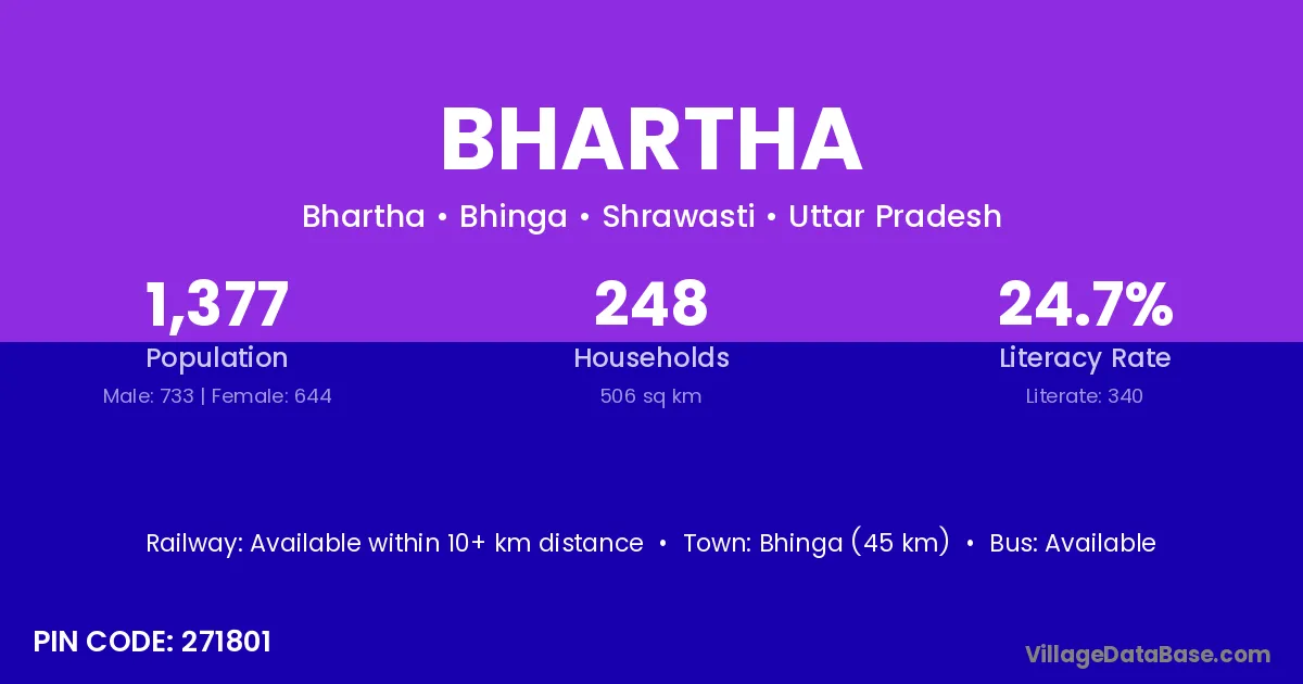 Bhinga (45 km) is the nearest town to Bhartha village for major economic activities and is located approximately 45 km away.