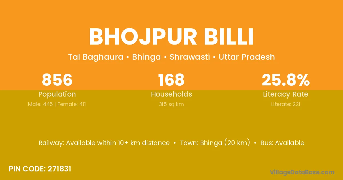 Bhinga (20 km) is the nearest town to Bhojpur Billi village for major economic activities and is located approximately 20 km away.
