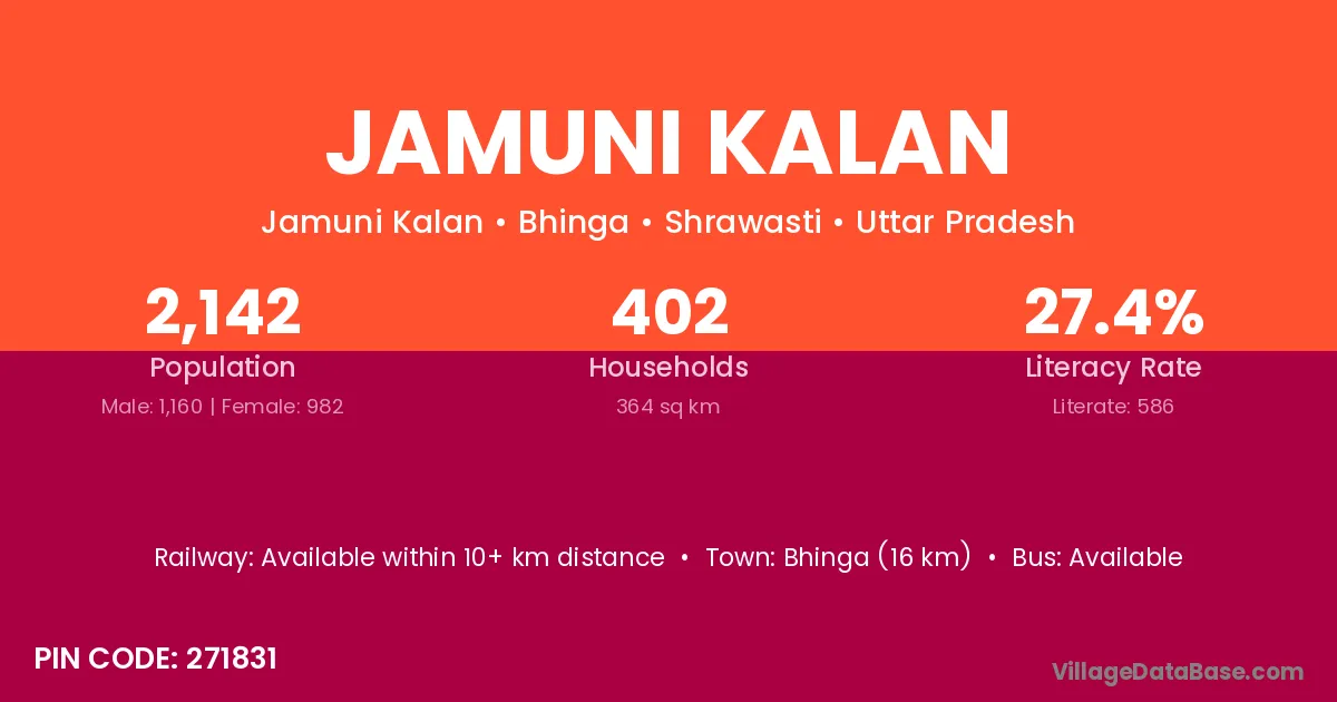 Bhinga (16 km) is the nearest town to Jamuni Kalan village for major economic activities and is located approximately 16 km away.
