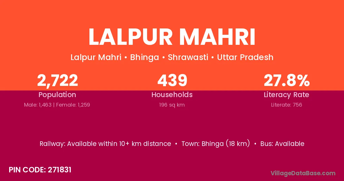 Bhinga (18 km) is the nearest town to Lalpur Mahri village for major economic activities and is located approximately 18 km away.