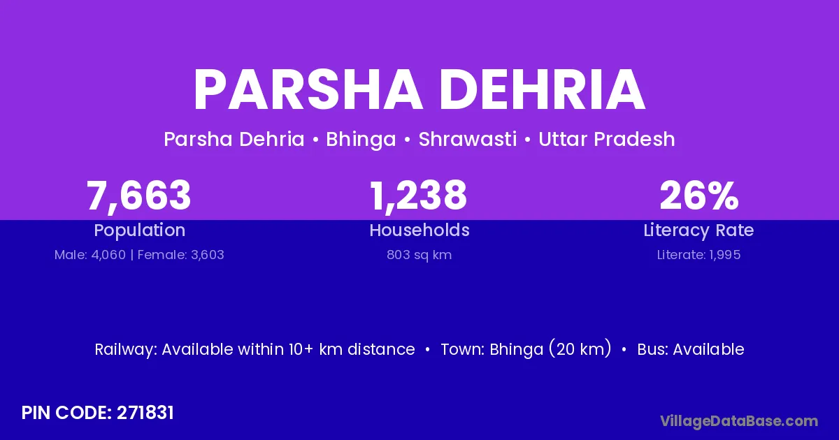 Bhinga (20 km) is the nearest town to Parsha Dehria village for major economic activities and is located approximately 20 km away.