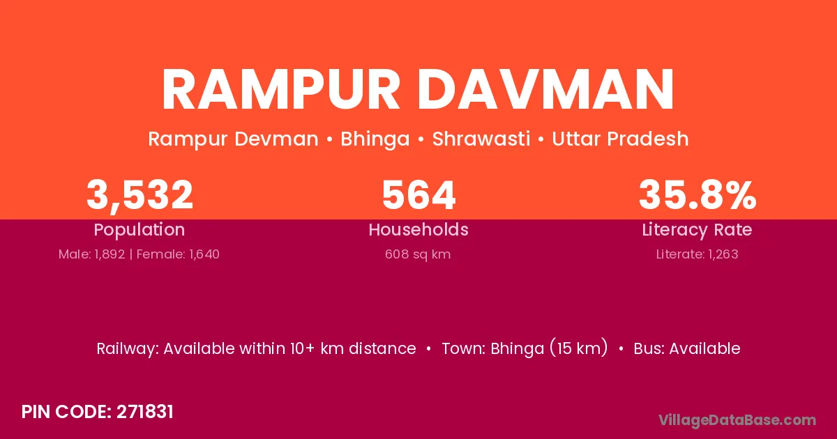 Bhinga (15 km) is the nearest town to Rampur Davman village for major economic activities and is located approximately 15 km away.