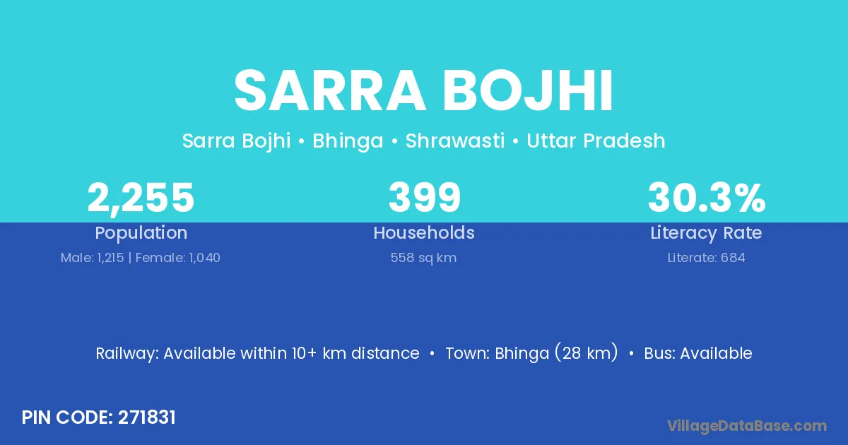 Bhinga (28 km) is the nearest town to Sarra Bojhi village for major economic activities and is located approximately 28 km away.