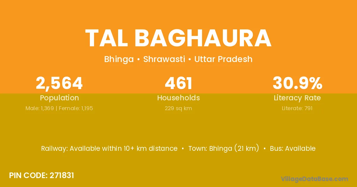 Bhinga (21 km) is the nearest town to Tal Baghaura village for major economic activities and is located approximately 21 km away.