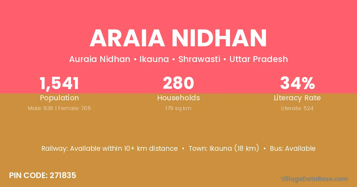 Ikauna (18 km) is the nearest town to Araia Nidhan village for major economic activities and is located approximately 18 km away.
