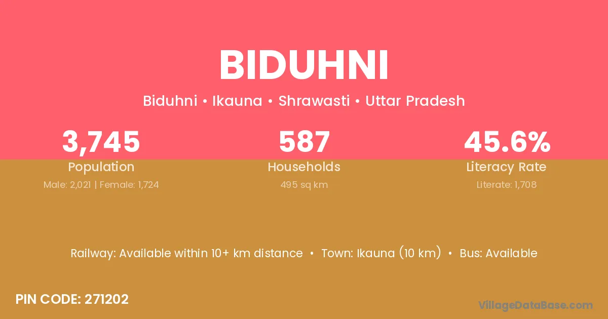 Biduhni village has a total population of 3,745 people, of which 2,021 are males and 1,724 are females.