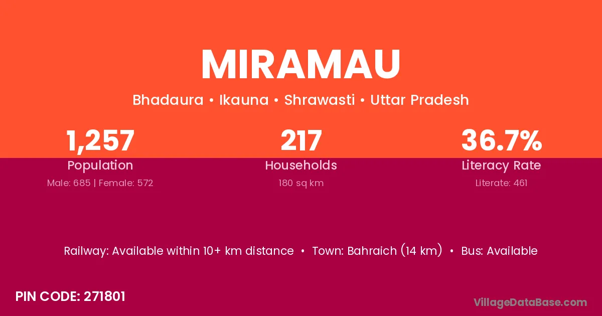 Bahraich (14 km) is the nearest town to Miramau village for major economic activities and is located approximately 14 km away.