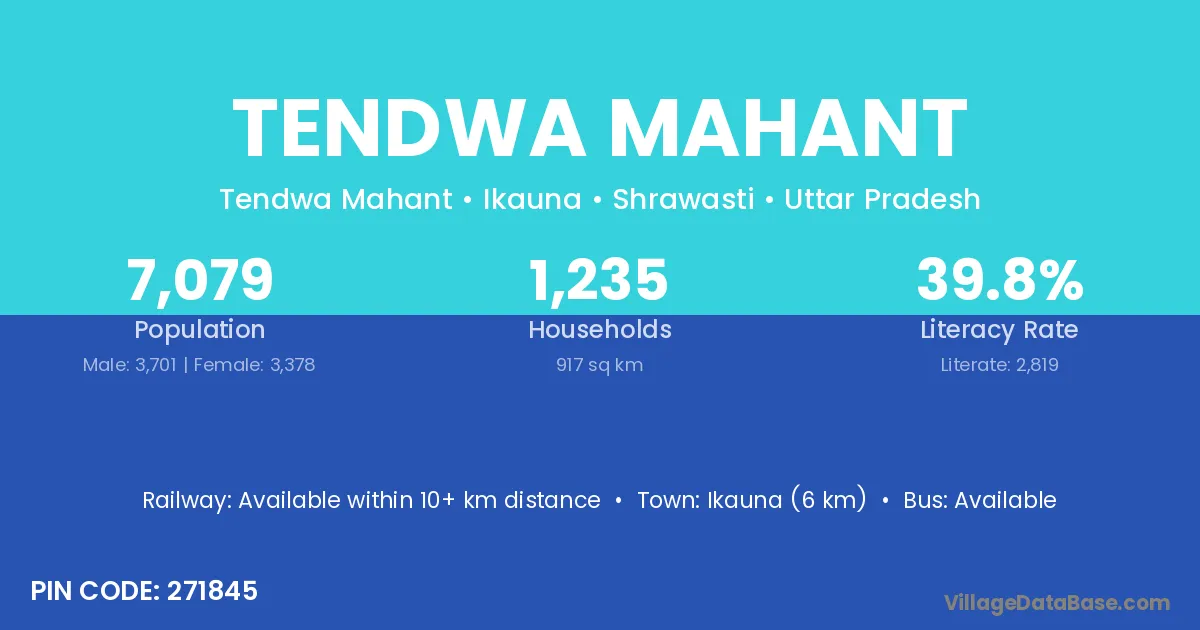 Tendwa Mahant village has a total population of 7,079 people, of which 3,701 are males and 3,378 are females.
