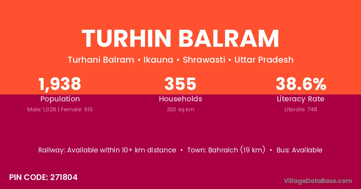 Bahraich (19 km) is the nearest town to Turhin Balram village for major economic activities and is located approximately 19 km away.