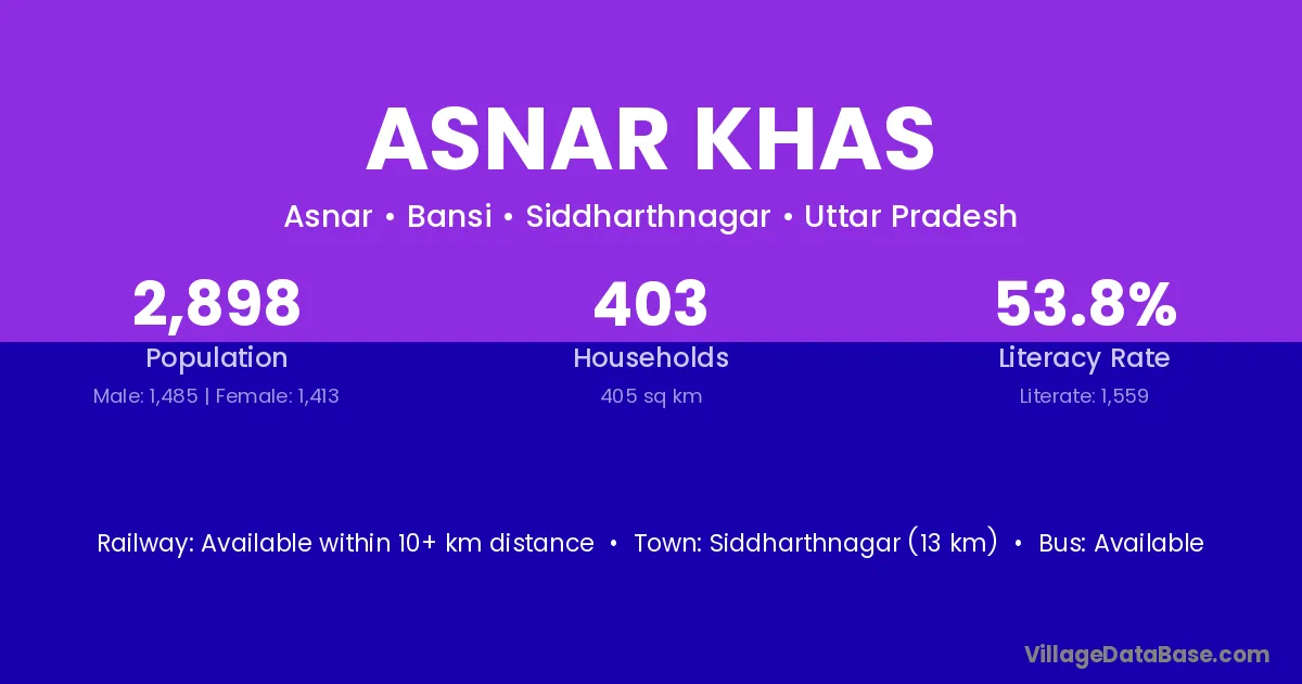 Siddharthnagar (13 km) is the nearest town to Asnar Khas village for major economic activities and is located approximately 13 km away.