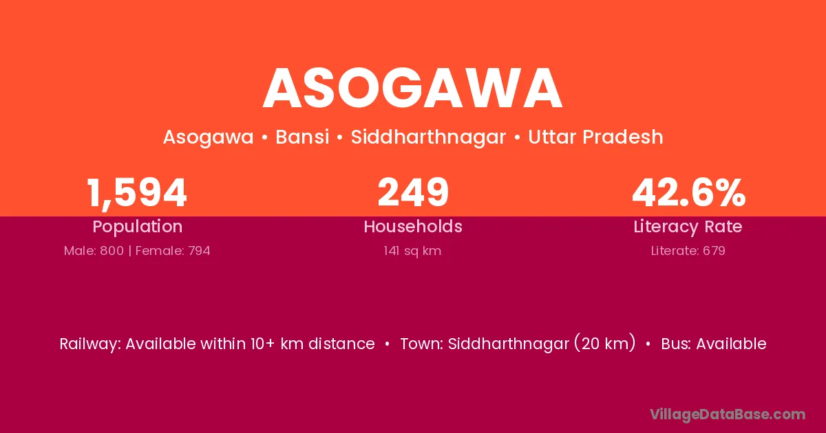 Siddharthnagar (20 km) is the nearest town to Asogawa village for major economic activities and is located approximately 20 km away.