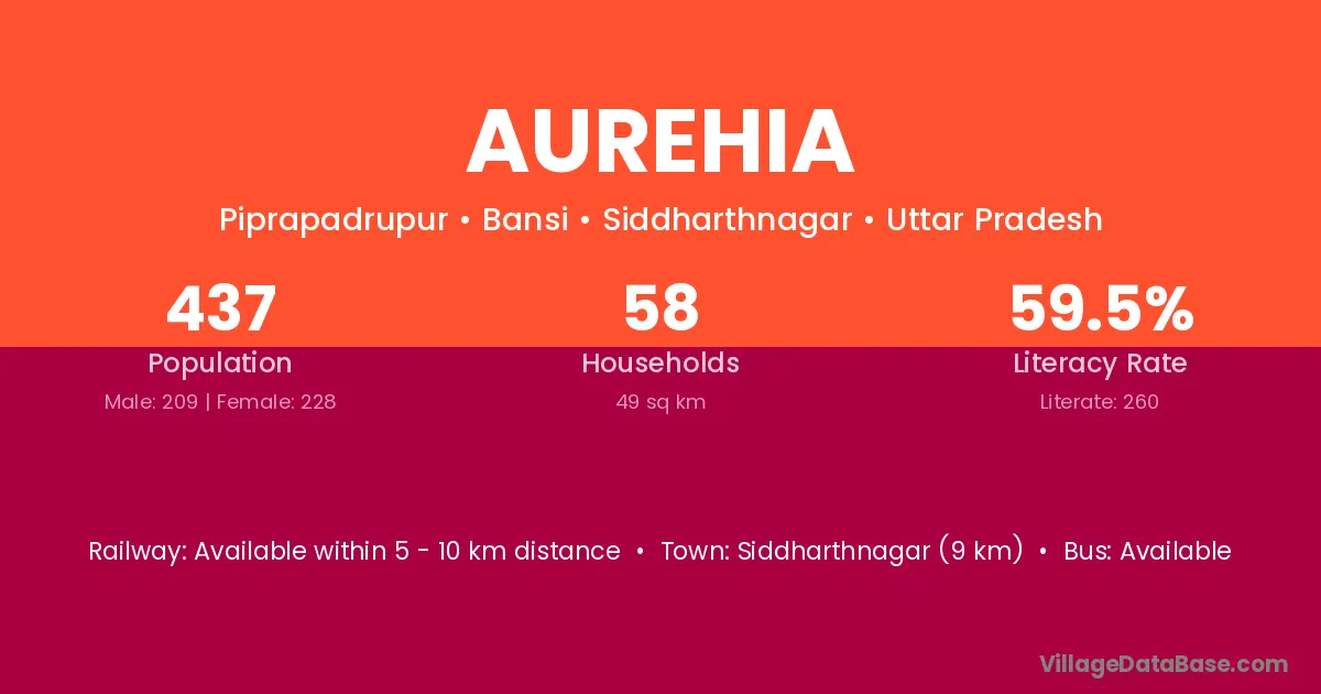 Siddharthnagar (9 km) is the nearest town to Aurehia village for major economic activities and is located approximately 9 km away.
