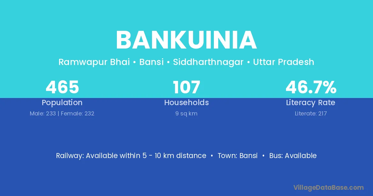 Bankuinia village has a total population of 465 people, of which 233 are males and 232 are females.