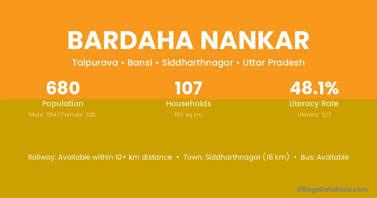Siddharthnagar (16 km) is the nearest town to Bardaha Nankar village for major economic activities and is located approximately 16 km away.