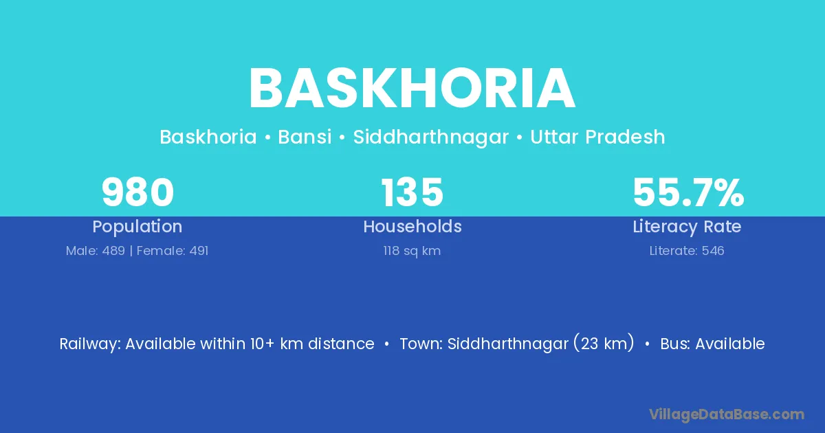 Siddharthnagar (23 km) is the nearest town to Baskhoria village for major economic activities and is located approximately 23 km away.