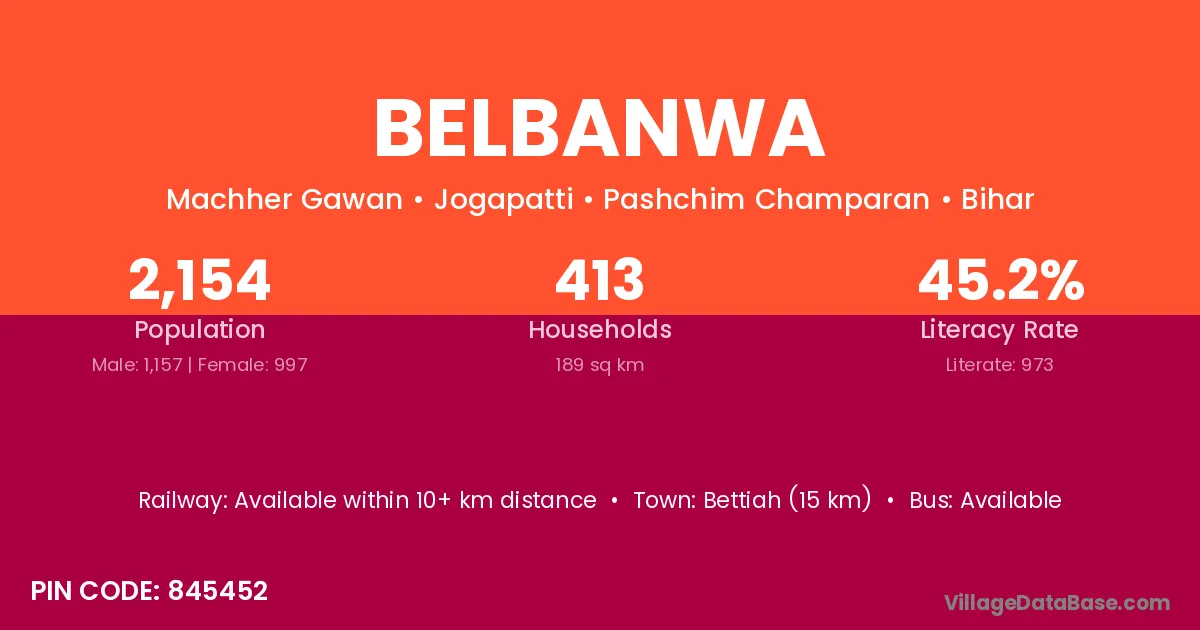 Siddharthnagar (22 km) is the nearest town to Belbanwa village for major economic activities and is located approximately 22 km away.