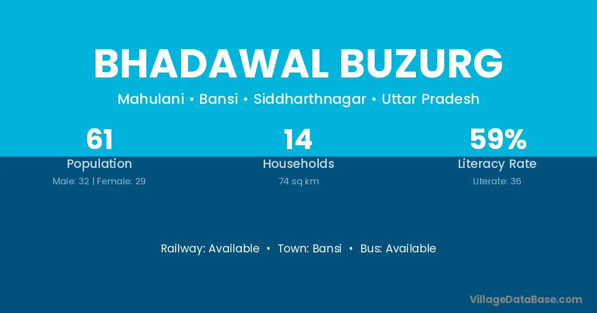Bhadawal Buzurg village has a total population of 61 people, of which 32 are males and 29 are females.